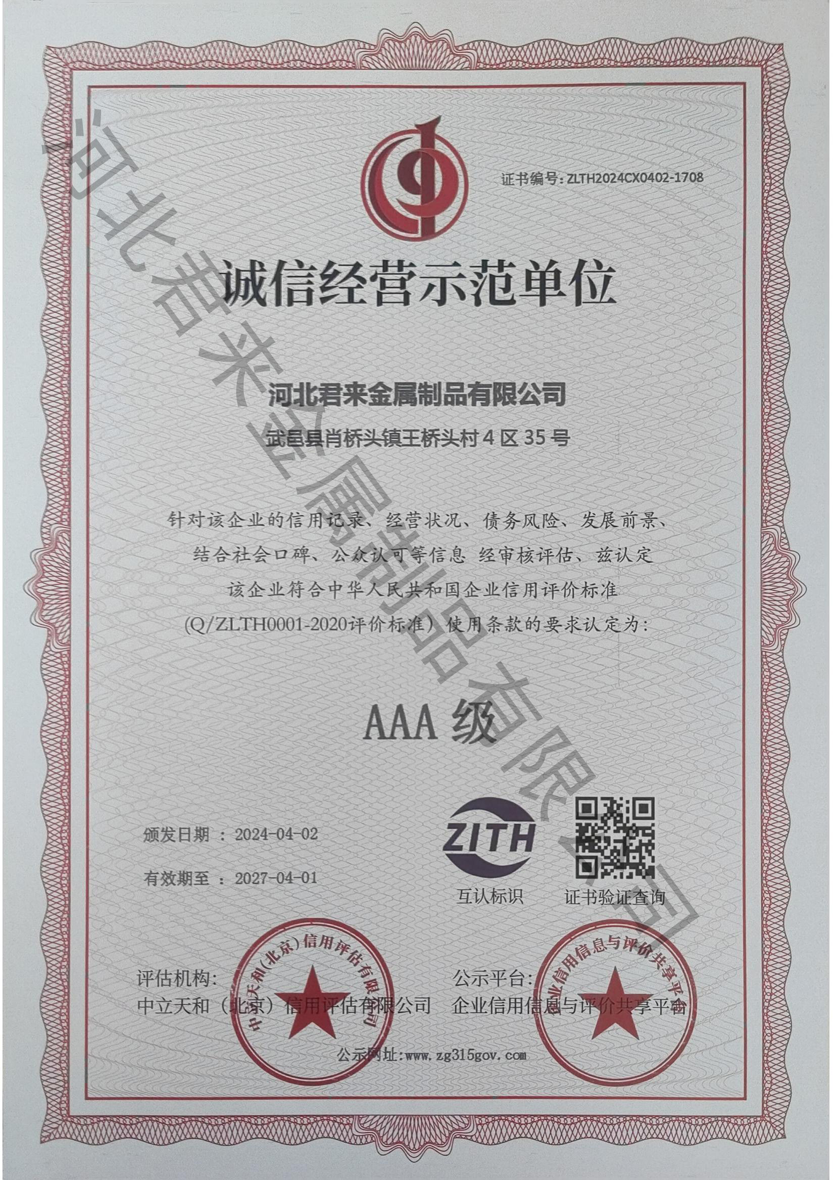 誠(chéng)信經(jīng)營(yíng)示范等級(jí)證書