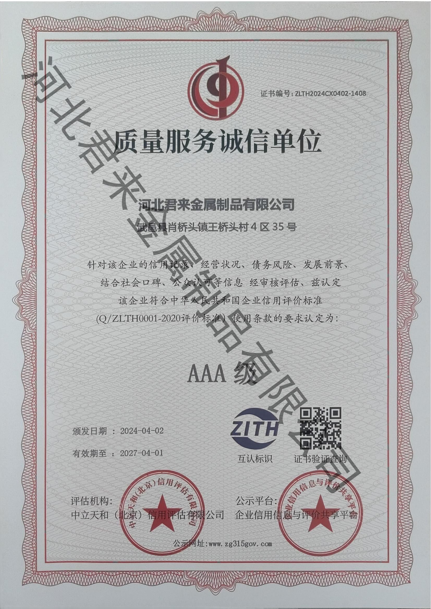 質(zhì)量服務(wù)誠(chéng)信等級(jí)證書