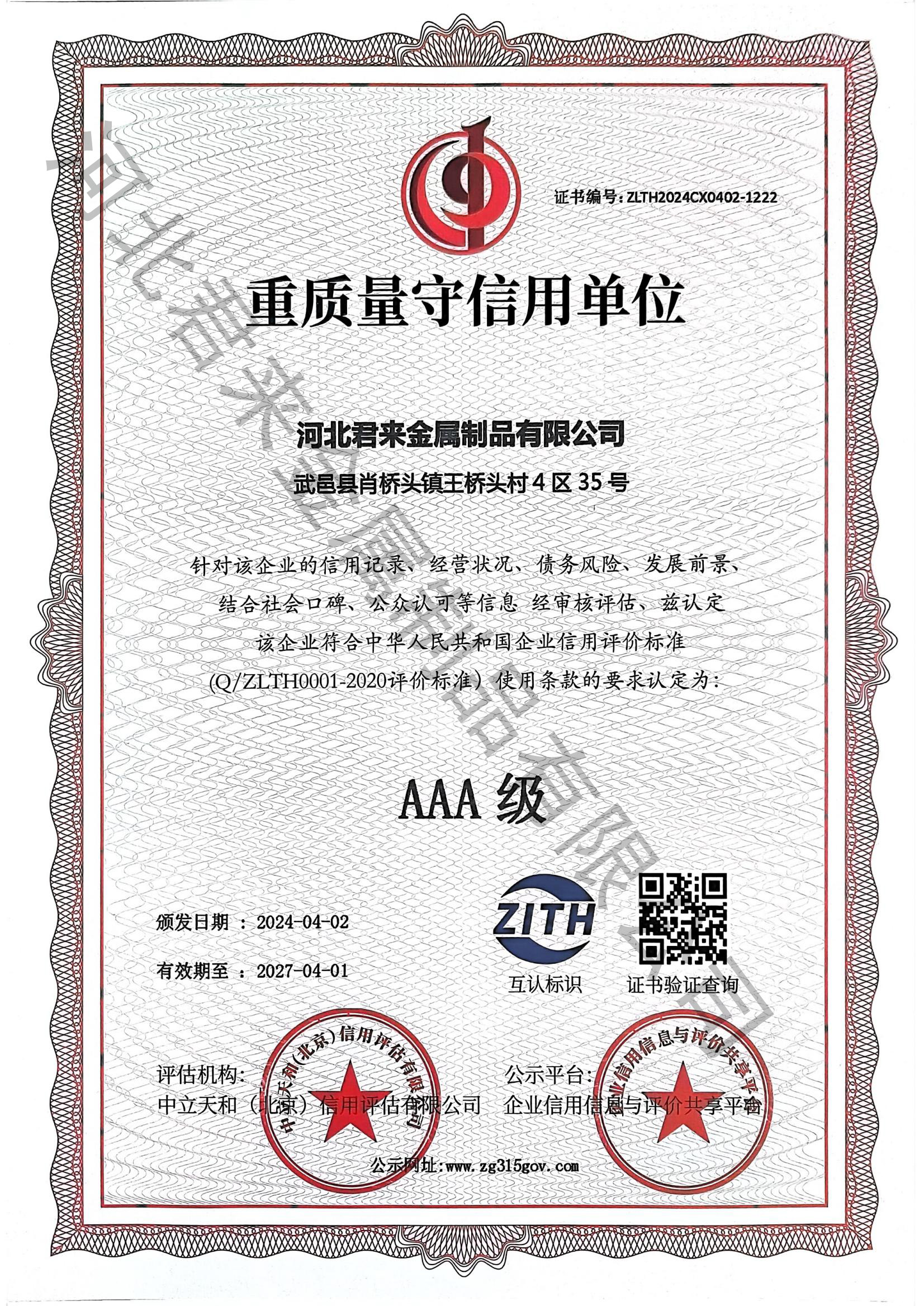 重質(zhì)量守信用等級(jí)證書